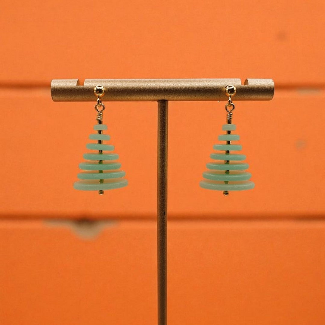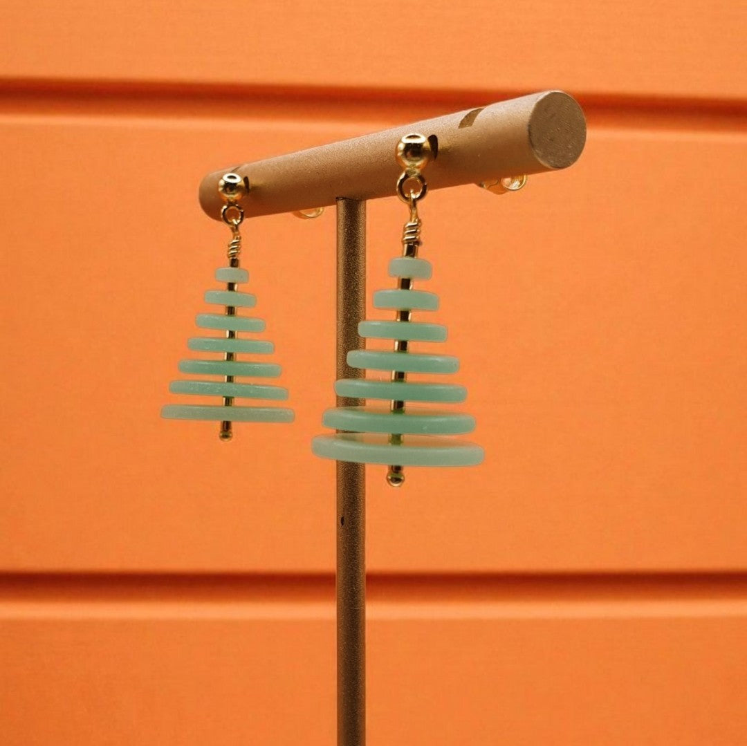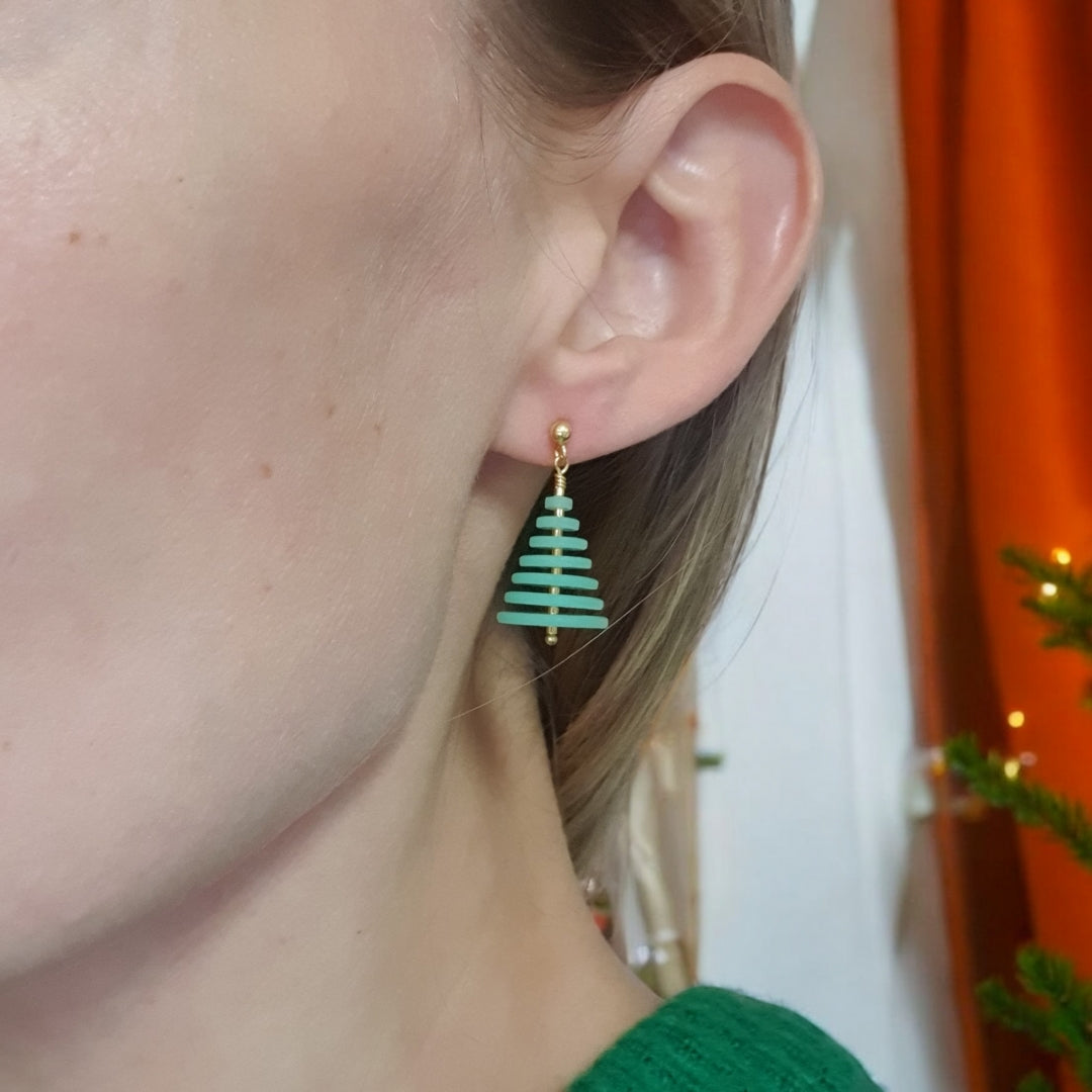Øreringe, der består af små cirkler af polymerler - sat sammen, så det ligner juletræer. Ørestikkerne øverst er af 18 karat forgyldt 925 sterlingsølv.