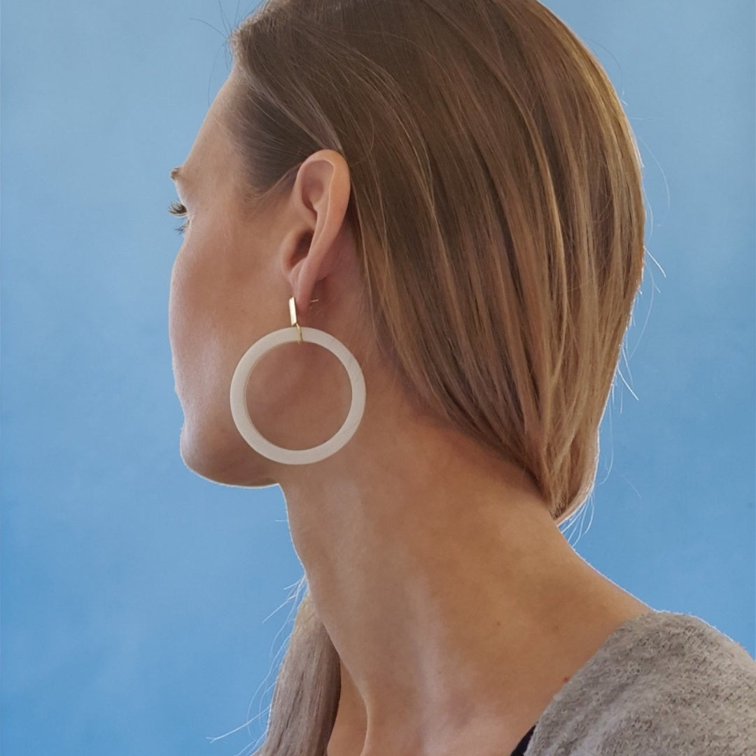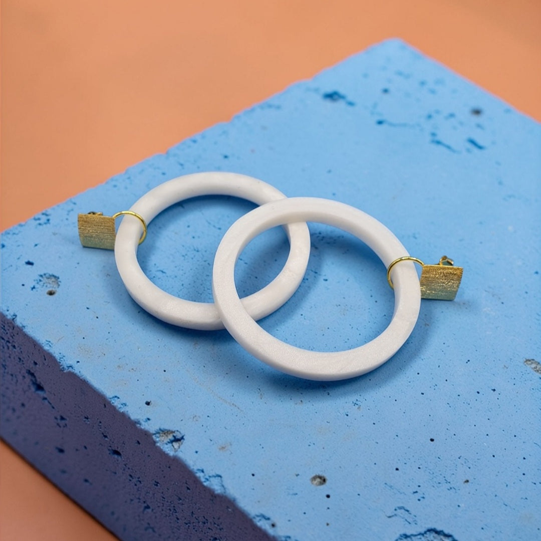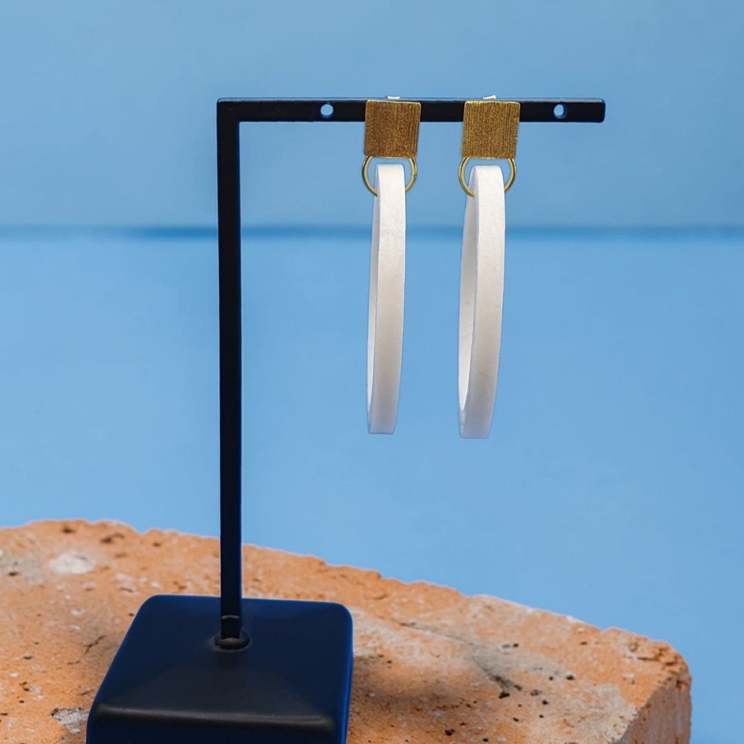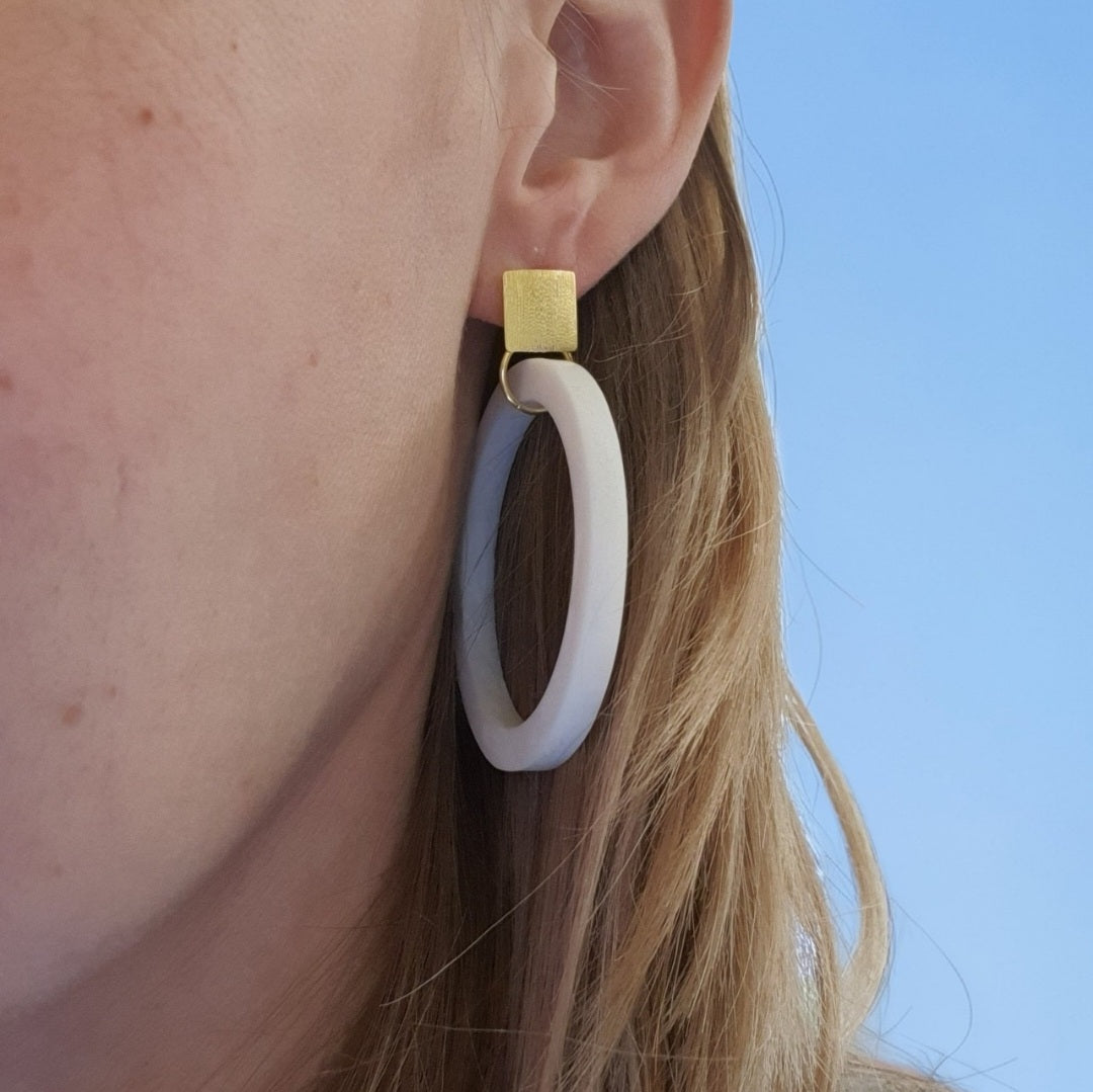 Håndlavede øreringe bestående af en stor cirkel lavet af polymerler påsat en ørestik med en børstet firkantet plade af 18 karat forgyldt 925 sterlingsølv.