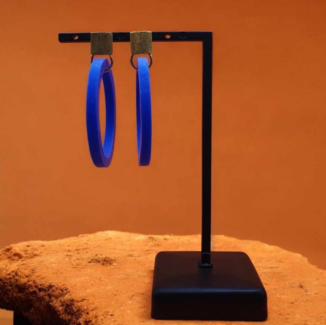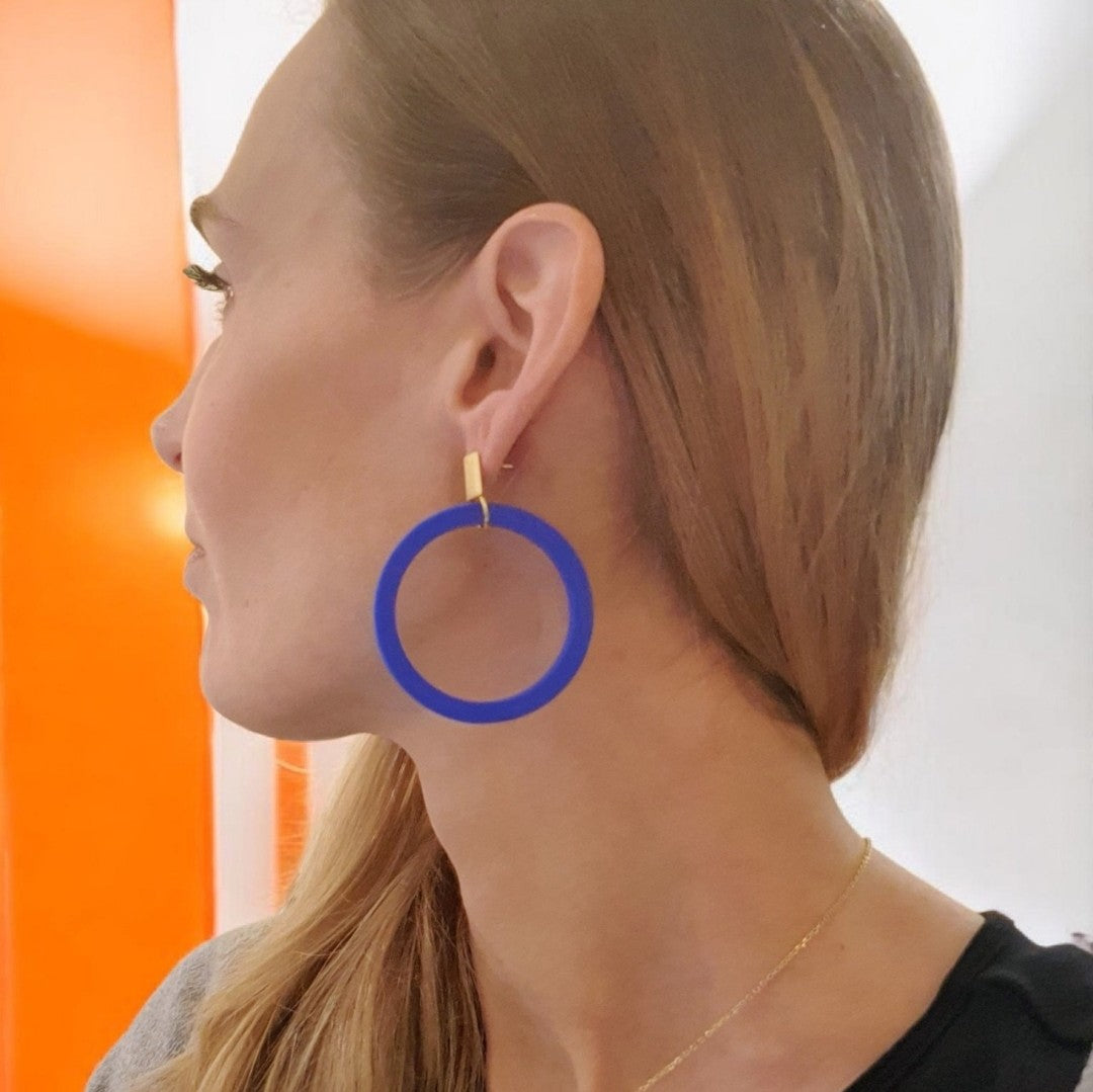 Håndlavede øreringe bestående af en stor cirkel lavet af polymerler påsat en ørestik med en børstet firkantet plade af 18 karat forgyldt 925 sterlingsølv.