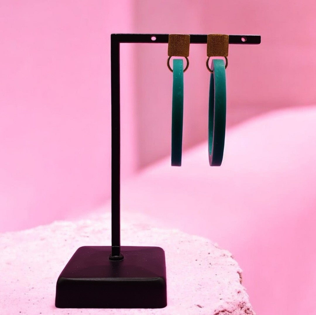 Håndlavede øreringe bestående af en stor cirkel lavet af polymerler påsat en ørestik med en børstet firkantet plade af 18 karat forgyldt 925 sterlingsølv.